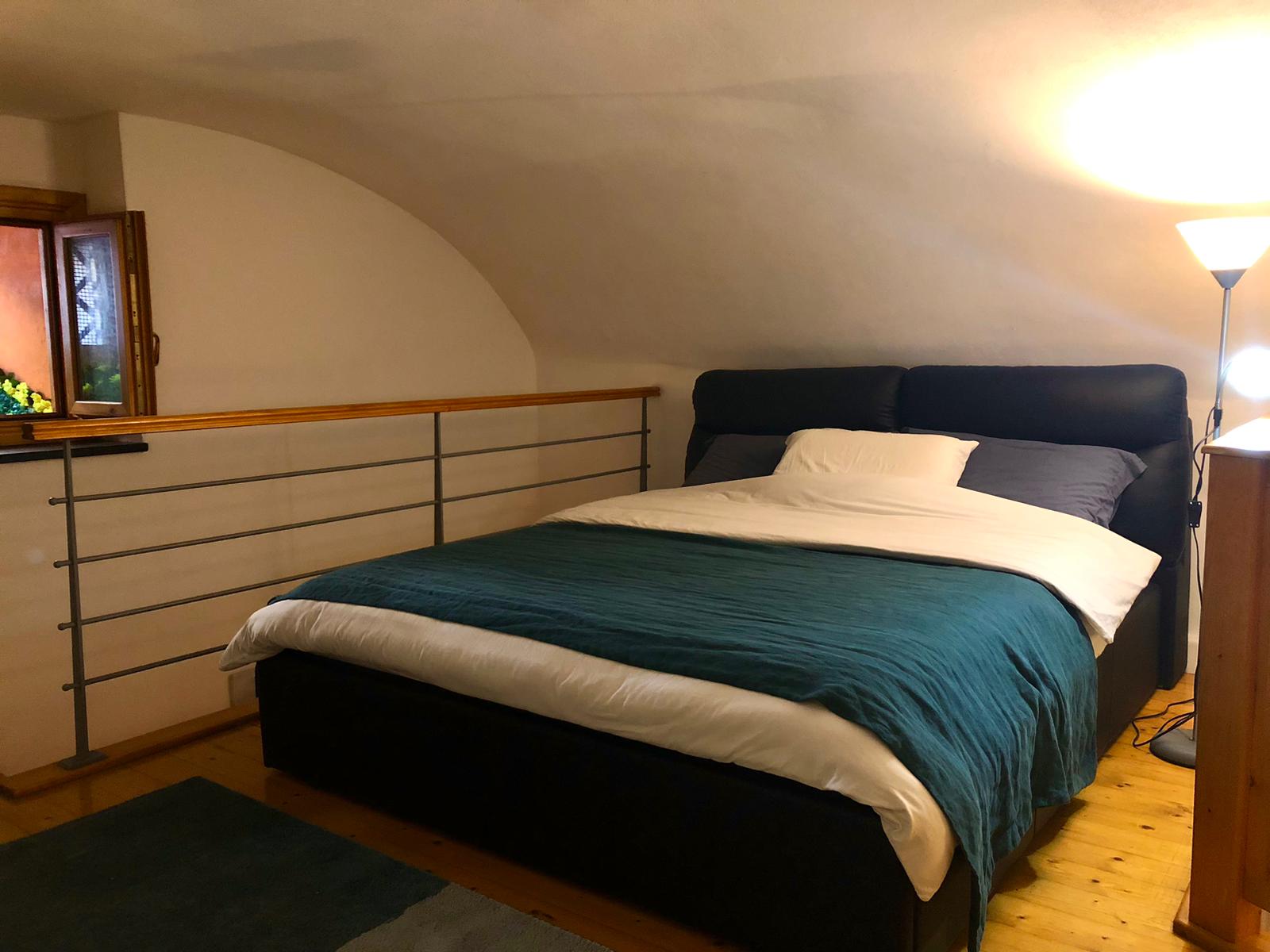 L’ingresso si apre su una zona living accogliente, con cucina attrezzata e spazi ben distribuiti. Il bagno con doccia e area lavanderia completa il piano. La scala conduce al soppalco, organizzato in zona notte con due letti matrimoniali, soluzione che permette di ospitare comodamente più persone mantenendo praticità e comfort.