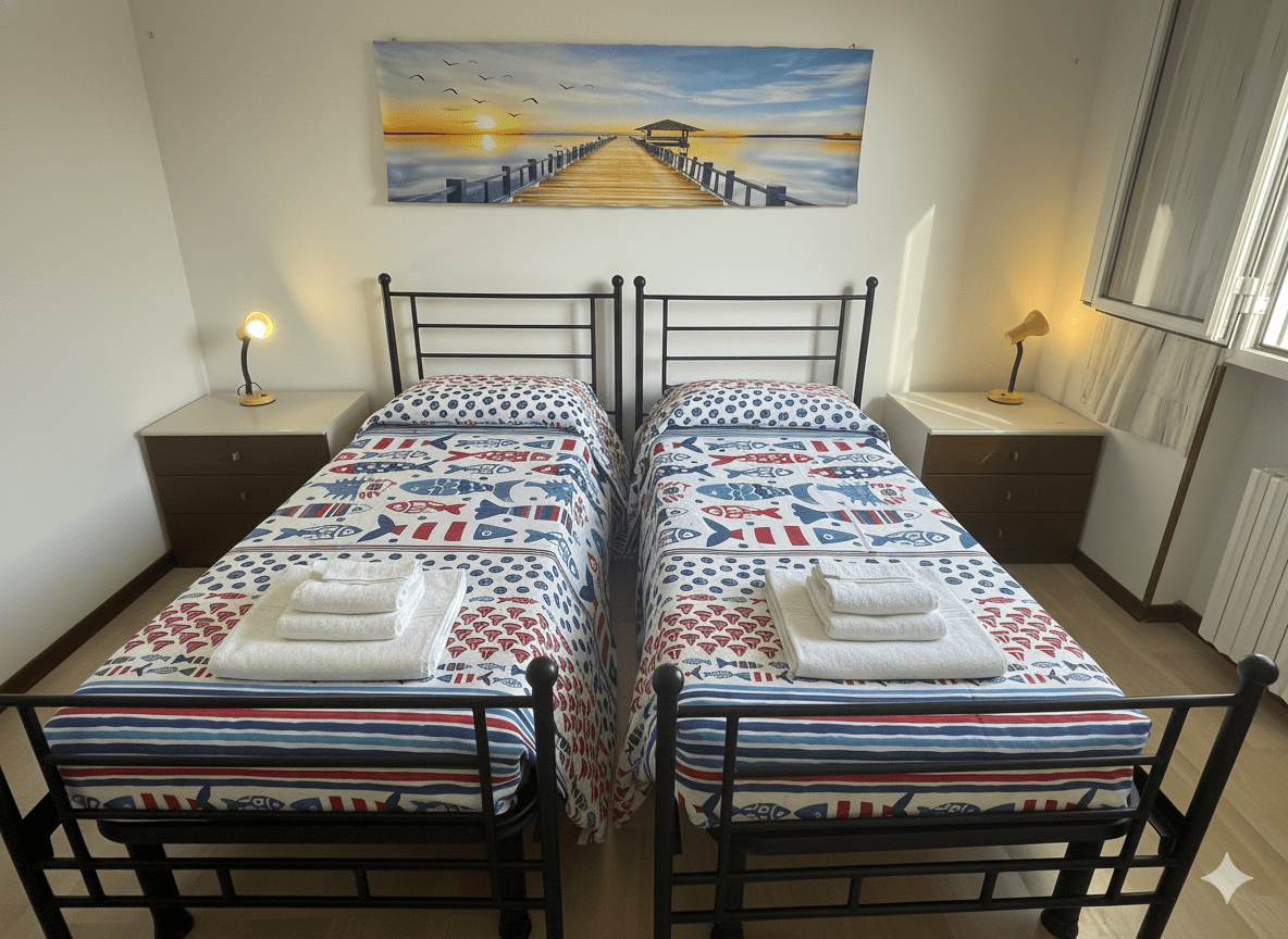 Situato al primo piano senza ascensore, l’appartamento offre spazi semplici e funzionali, ideali per una vacanza in famiglia. L’alloggio è composto da ingresso, zona pranzo con cucinino, camera matrimoniale con balcone, seconda camera con due letti singoli e bagno completo con doccia. Ambienti ben distribuiti e pratici per soggiorni al mare.